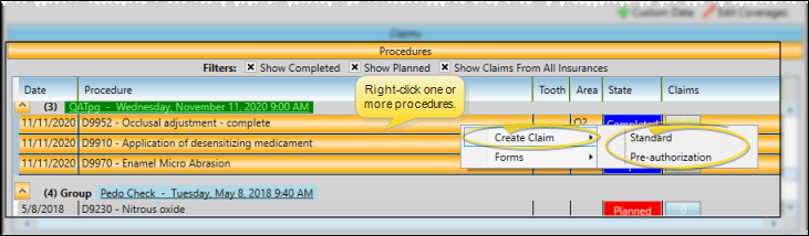 Create Insurance Claim - You generate pediatric dentistry insurance forms for one or more dental procedures from the Procedures tab of the patient's Insurance page. Right-click a procedure, or hold down the Shift key to select multiple procedures, then right-click, and select Create Claim. For planned procedures, you can only create a pre-authorization claim: For completed procedures, you can choose either a pre-authorization or standard claim. (Once a claim is created you submit it from the Claim Center.)