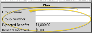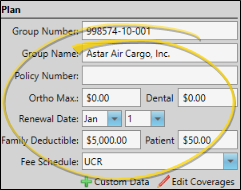 - The Plan section of the window displays the group, policy, and coverage details for the selected insurance company, along with any custom data fields and specific coverage details.