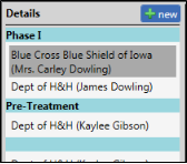 The patient's list of existing insurance detail records appears at the left. Click the record to work with. The details for that record will appear at the right. Since each insurance detail record is associated with a single treatment phase and contract, it is very common for a patient to have multiple records.