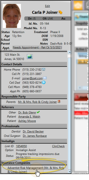 Open from Patient Folder Widget - Enable the Insurance Companies patient folder widget to view the list of active insurance plans for the patient on the Patient Information Panel. You can click the link to open the patient folder to that insurance plan. See "Patient Folder Widgets" for details.