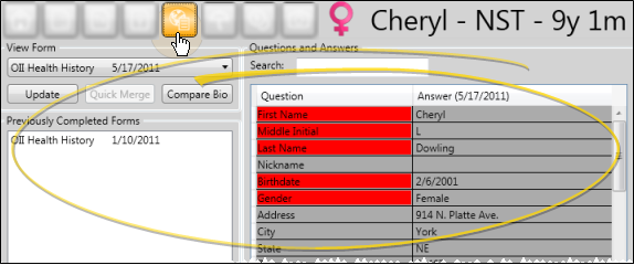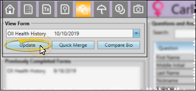 After a patient has completed at least one online form, you can launch the most recent form from the Online Forms page of the patient folder to make updates to the responses. Click Update to open the most recent online form, and ask the patient to make any changes. After the information is updated, and all required responses have been completed, click Submit at the bottom of the form. The updated form will be listed in the patient folder, along with the date. You might then want to use the Compare Bio button, described above, to update the patient folder as well. (See "Fill Out and Submit Online Forms" for details about completing online forms.)