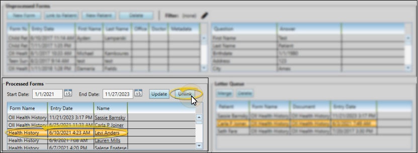 Online forms linked in error cannot be removed directly from the patient's Online Forms page, but can be unlinked from the Processed Forms section of the Online Forms window. See "Unlink a Form" for details.