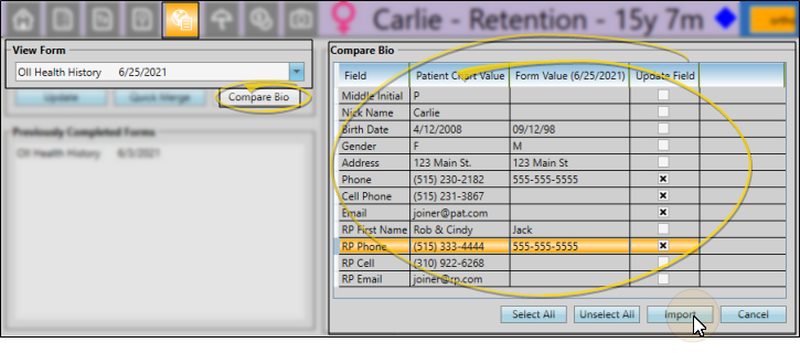 Use the View Form drop down to select the online form you want to work with. Then, click Compare Bio to show any discrepancies between the selected form and the biographical information currently in the patient folder. You can individually select fields you want to update, or click Select All or Select None as needed. When you click Import at the bottom of the window, the corresponding patient folder fields will be updated to match the data in the online form.