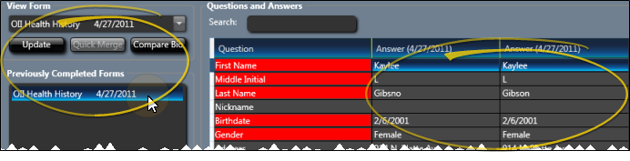 When a patient has completed two or more online forms of the same type, you can compare the results of those forms. Use the View Form drop down to select the online form you want to work with. Then select the second form you want to compare from the Previously Completed Forms section of the window to see the differences between the forms. If you use multiple types of online forms, only forms that are the same type as your selected form appear in the Previously Completed Forms list.