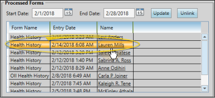 You can open the patient's Online Forms page by clicking the patient name from the Processed Forms section at the bottom of the Online Forms window. See "Download and Link Online Forms" for details.