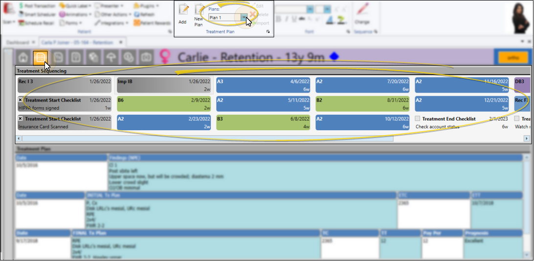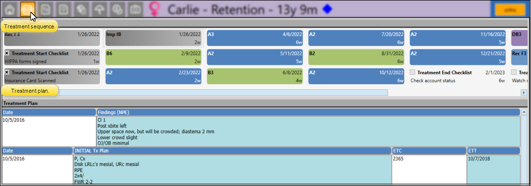 Open the patient folder and select the Treatment Plan tab in the patient folder header. The treatment sequence appears at the top of the window, and the treatment plan appears in the bottom portion of the window.