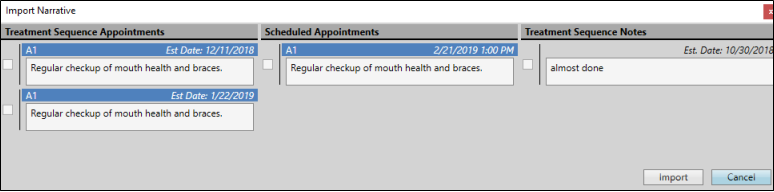 Appointment and Treatment Sequence Narrative / Treatment Chart Integration - Use the Import Narrative tool to add notes from the scheduled appointment and / or Treatment Sequence items directly into the patient's treatment chart. To function, you need a treatment chart style column with either the Text Only or List and Text column type.