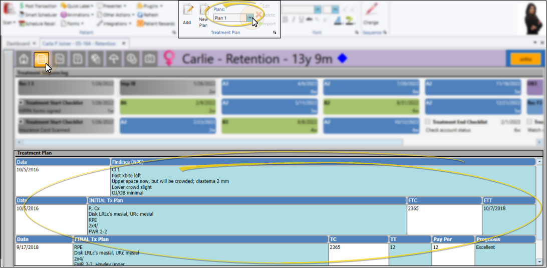 The patient's treatment plan records appear below the treatment sequence. If the patient has multiple treatment plans, you can select which one you want to view and work with in the Treatment Plan section of the ribbon bar.Treatment plan records are listed underneath the style you selected when creating the record, so you accumulate a categorized and chronological record of planning activity.