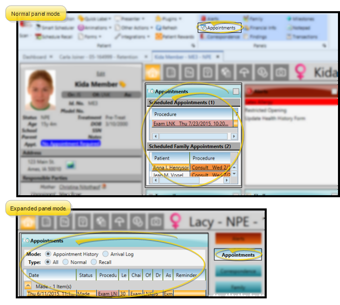 View / Go To Family Appointments - (Available in collapsed view only; also available from the Smart Scheduler.) The Family Appointments section of the panel indicates the number of family appointments currently scheduled. You can click a patient name to open that patient folder, or click an appointment to open that date in your Scheduler.