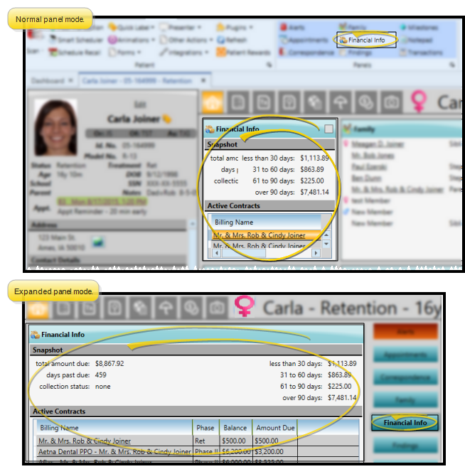 Use the Financial Information panel of the patient folder Home page to view a snapshot of the combined financial summaries for all responsible party and insurance accounts associated with this patient's treatment, as well as the list of currently active contracts.