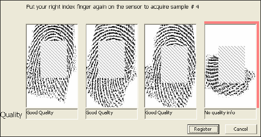 Register Files - Click Register when four good samples have been acquired, then click Yes to verify the fingerprint data.