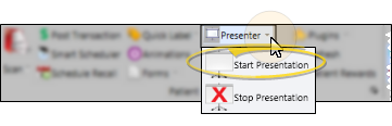 From your main monitor, click the arrow beside the Presenter icon in your ribbon bar, and select Stop Presentation. Or, simply click the X in the upper-right corner of the Presenter screen. This will end the presentation session, and return your secondary screen to normal dual-monitor use.