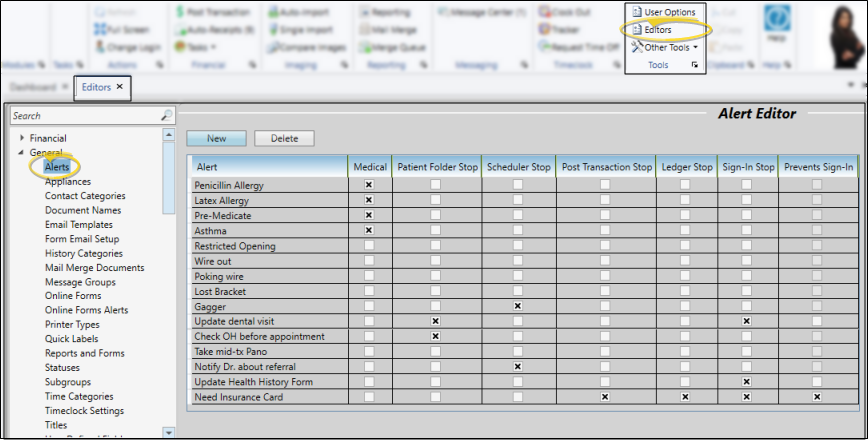Run the Alert List report to obtain a list of the alert descriptions you have created to use in patient folders. Ad-hoc alerts you typed into patient folders, and descriptions you deleted from the Alerts editor are not included. The report indicates whether the description is flagged as a medical alert.