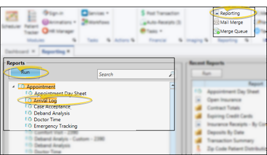 • Home ribbon bar > Reporting section > Reporting > Appointment > Arrival Log > Run. (You can also use the Search field to find the report you want to work with.) You might also be able to run this report from your Recent Reports or Quick Reports list. See "Run Edge Cloud Reports" for details.