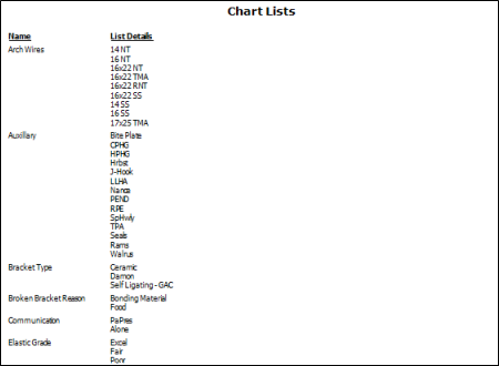 Run the Chart List report, available from the Tables section of your Reporting window, to view the active lists that you have created to use with your Treatment Chart and Treatment Plan styles, in alphabetical order. The report includes both the name of the list and all of the responses in that list. Only active records are included in the report: Any items flagged Inactive in the editor are omitted.