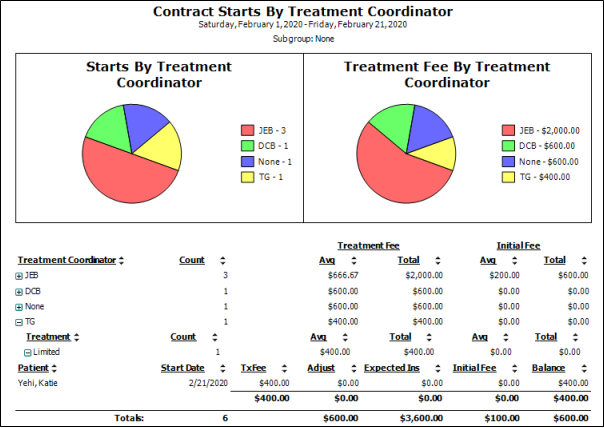 Run the Contract Starts by Treatment Coordinator report to obtain a list of the patient contract starts for each of your treatment coordinators for any range of dates. You can view a summary of the report that includes the number of starts, average treatment fee, total treatment fee, and average and total initial fee. Expand the details of one or more treatment coordinators to view additional information, including the treatment phase, patient name, start date, and contract details for that patient. A graph at the top of the report shows the percentage of starts and treatment fees allotted to each treatment coordinator.