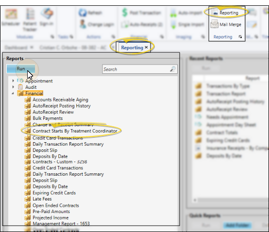 Select Reporting from the Reporting section of the Home ribbon bar. Then from the Financial section, open the Contract Starts by Treatment Coordinator report. You can double-click the report name, or click Run at the top of the window to continue. (You can also use the Search field to find the report you want to work with.) You might also be able to run this report from your Recent Reports or Quick Reports list. See "Run Edge Cloud Reports" for details.
