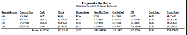 Run the Deposits by Date report to obtain the deposit totals as calculated on your Transaction reports. The report includes a breakdown of each type of receipt posted. When generated for a range of dates (such as the first and last days of a month), the report includes one line for each transaction report generated within that time.