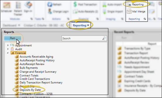 Select Reporting from the Reporting section of the Home ribbon bar. Then from the Financial section, open the Deposits by Date report. (You can also use the Search field to find the report you want to work with.) You might also be able to run this report from your Recent Reports or Quick Reports list. See "Run Edge Cloud Reports" for details.