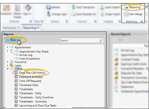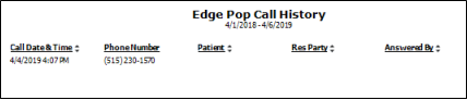 Run an Edge Pop Call History report to obtain a list of calls that you received via the Edge Pop service, including the call date and time, phone number, patient and responsible party name, and the employee that answered the call. You can choose to include calls received by one or more employees, or include all employees.