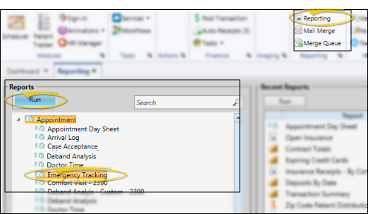 - Home ribbon bar > Reporting section > Reporting > Appointment > Emergency Tracking > Run. (You can also use the Search field to find the report you want to work with.) You might also be able to run this report or form from your Recent Reports or Quick Reports list. See "Run Edge Cloud Reports" for details.