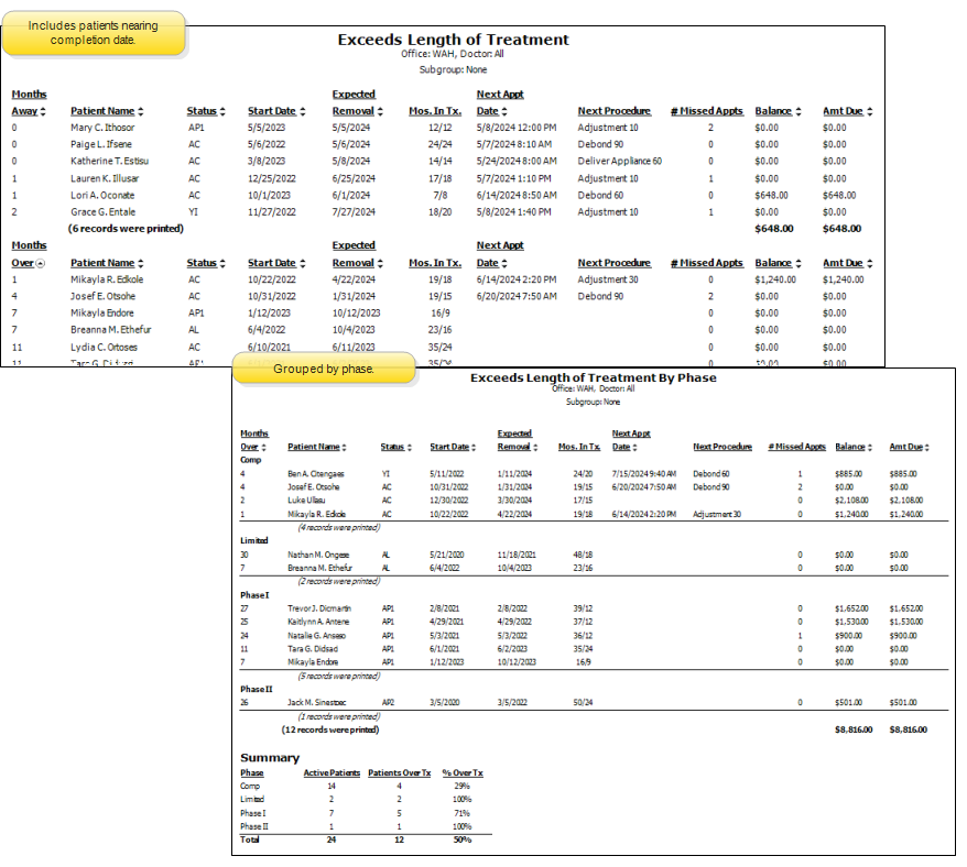 Run the Exceeds Length of Treatment report to obtain a list of patients who have gone past the month of their expected appliance removal date, and do not yet have an actual appliance removal date for their current treatment phase. These patients may have prolonged treatment, or may simply be patients for whom you have not yet entered the appropriate removal date.The next appointment procedure (if any) and number of missed appointments are included in the report to help you track down any problems. The report prints in landscape mode (sideways) to accommodate the many included fields. The number of patients is included at the bottom of the report. You can optionally include patients who are nearing completion, and group the report by treatment phases.