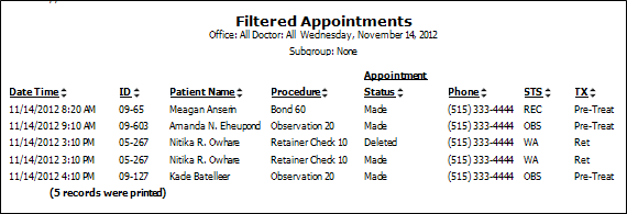 Run a Filtered Appointments report to obtain a list of appointment data for a specific date, or any range of dates. You can narrow the list of appointment to include only certain procedures, appointment statuses (made, kept, etc.),orthodontists, and / or offices. The report includes the appointment date and time, patient name and id, scheduled procedure, appointment status, patient phone number, patient status and treatment phase.