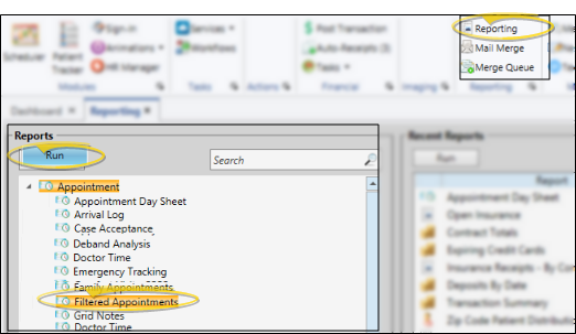 - Home ribbon bar > Reporting section > Reporting > Appointment > Filtered Appointments > Run. (You can also use the Search field to find the report you want to work with.) You might also be able to run this report or form from your Recent Reports or Quick Reports list. See "Run Edge Cloud Reports" for details.