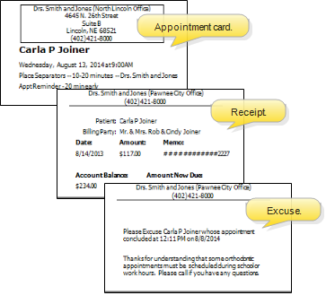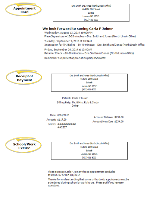Full Sheet - This format prints on plain paper. It can include up to three future appointments, a receipt for the most recent payment, and a school / work excuse stamped with the current date and time: All sections you select print on a single sheet of paper. You can optionally include section titles and office headers on each portion of the card.