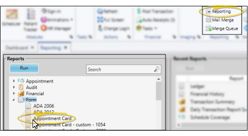 Reporting Window - Select Reporting from the Reporting section of the Home ribbon bar. Then from the Form section, open the Appointment Card. (You can also use the Search field to find the form you want to work with.) You might also be able to run this form from your Recent Reports or Quick Reports list. See "Run Edge Cloud Reports" for details. This option does not automatically select a patient to print for.