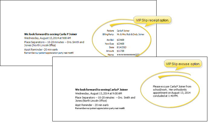 Show Appointment Reminder - (Not available for VIP Slip and 4.25" formats: These formats always include this information.) Enable this option to include the scheduled appointment information on the card. Disabling this option provides you with a way to generate a school/work excuse or payment receipt for today's appointment without including the next scheduled appointment information on the card.