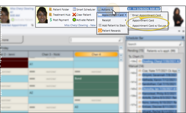 Scheduler Ribbon Bar - Select Actions from the Active Patient section of the Scheduler ribbon bar. Then choose either the Appointment Card or Appointment Card W/Excuse option. If there is an active patient in your Scheduler, the appointment card will print for that person. Otherwise, you will use FastFind to search for the patient. (If you want to email the appointment card instead, please refer to that section of this help article.)