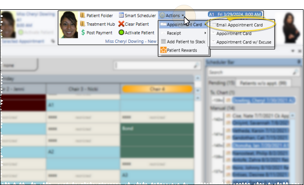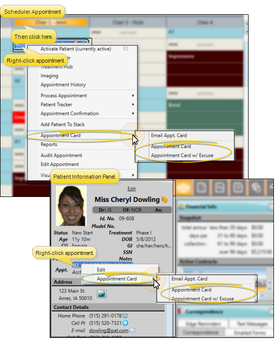 Scheduler Appointment / Patient Information Panel - Right-click an appointment from either the Scheduler or the patient's Patient Information Panel.Then choose the Email Appointment Card option. (If you want to print the appointment card instead of emailing it, please refer to that section of this help article.)