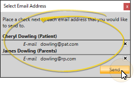 Select one or more email address to send the card to. All valid email addresses in both the patient and responsible party Contact information are available. The information is sent immediately, according to the Appointment Card settings you have in your Form Email editor.
