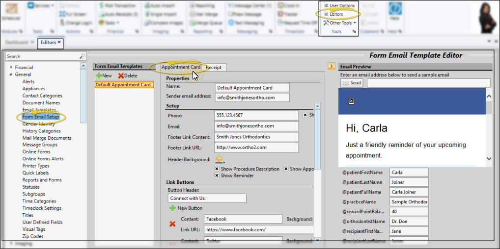 Use the Form Email Setup editor to create and manage appointment cards and payment receipts that you email to your patients and responsible parties. See "Form Email Setup Editor" for details.