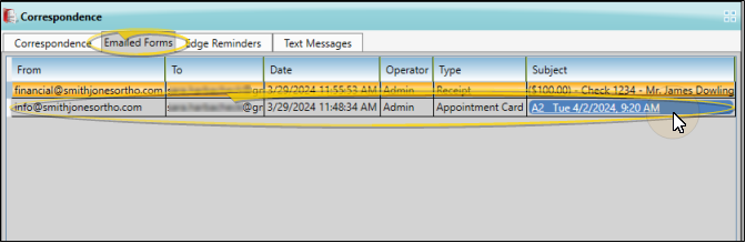 Use the Emailed Forms tab of the patient's correspondence history to review the appointment cards and payment receipts that were sent using the Edge Form Email feature, instead of being printed. See "Patient Correspondence History" for details.