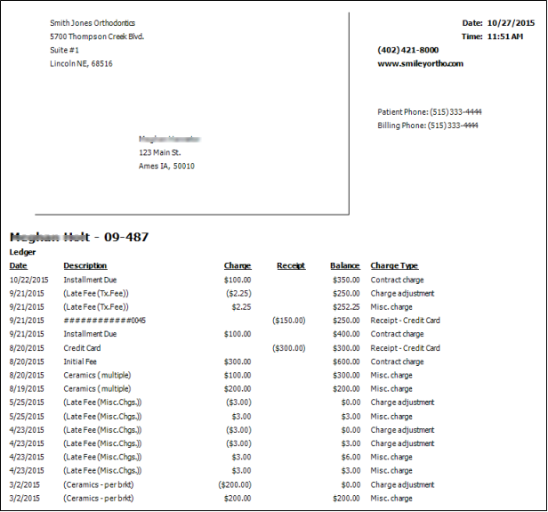 Consider a Financial History Instead - Run a Financial History to generate a list of transactions posted to any contract. You may print, export, or email the form, or capture it directly to the patient's correspondence history. When printed, the form uses plain 8.5" x 11" paper and an approved laser printer. It then can be tri-folded and mailed in our double-window envelope. See "Financial History Form" for details.