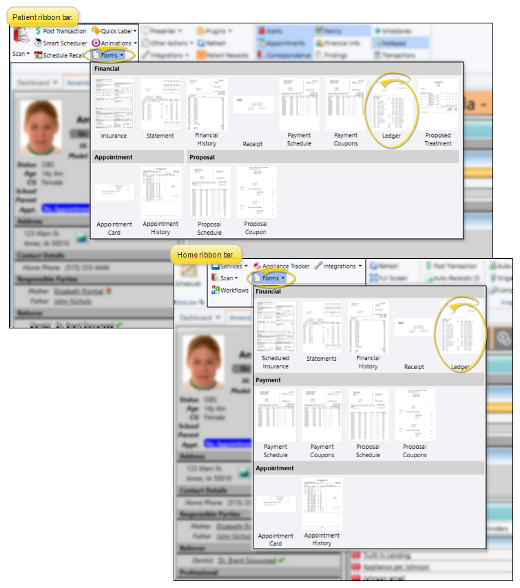 Select Forms then Ledger from the Patient section of the Patient ribbon bar, or from the Tasks section of the Home ribbon bar. (An Edge Cloud patient folder must be open for the Patient ribbon bar to be available.)