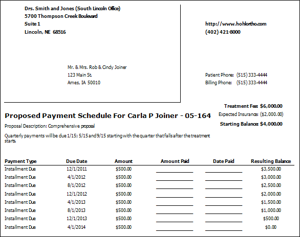 Run a Payment Schedule to generate the list of scheduled periodic transactions (i.e. initial fees and period fees) for an active orthodontic contract, including the transaction amounts and scheduled dates. The expected insurance is shown as in a lump sum at the top of the form. All contract fees are listed, even if some of them have already been paid. No miscellaneous charges are included on this form. Payment Schedules may be printed, exported, emailed, or captured directly to the patient's correspondence history.