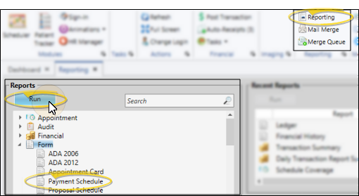 Select Reporting from the Reporting section of the Home ribbon bar. Then from the Form section, open the Payment Schedule form. (You can also use the Search field to find the form you want to work with.) You might also be able to run this form from your Recent Reports or Quick Reports list. See "Run Edge Cloud Reports" for details.