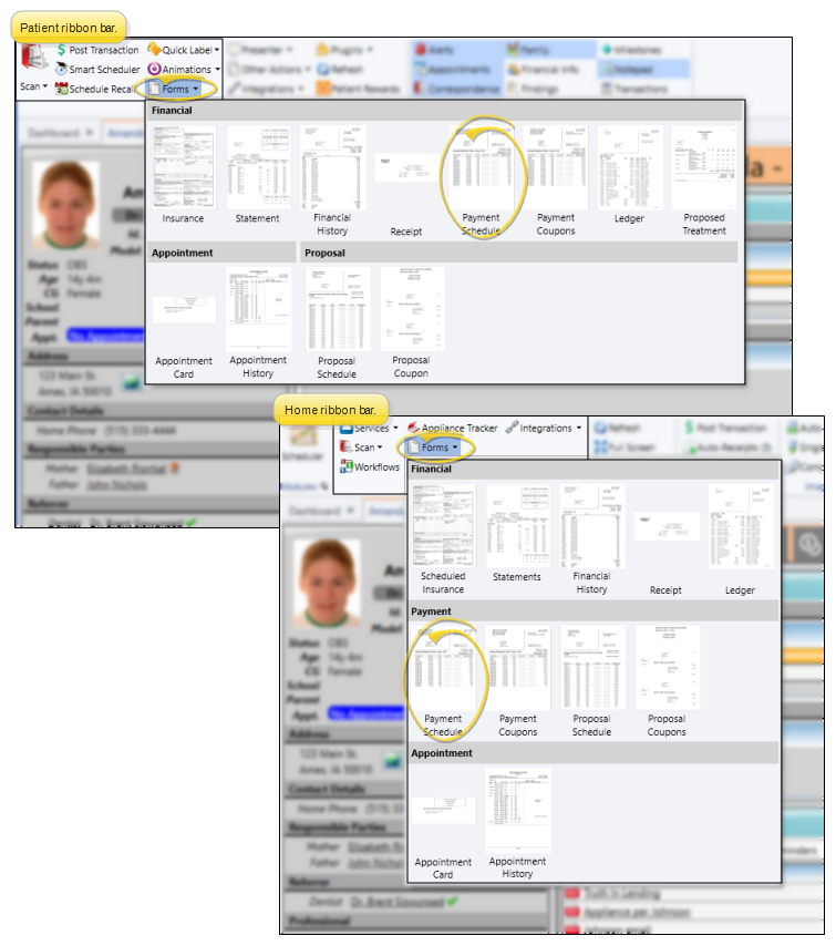 Select Forms then Payment Schedule from the Patient section of the Patient ribbon bar, or from the Tasks section of the Home ribbon bar. (An Edge Cloud patient folder must be open for the Patient ribbon bar to be available.)
