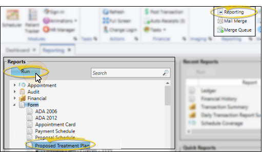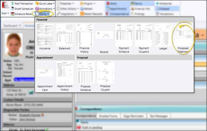 Select Forms then Proposed Treatment from the Patient section of the Patient ribbon bar. When you print a form from the Patient or Home ribbon bar, the results default to the Quick Report settings. If those settings include printing the form immediately, you will not have an opportunity to review before the form prints. See "Quick Reports" for details about creating / updating these settings.