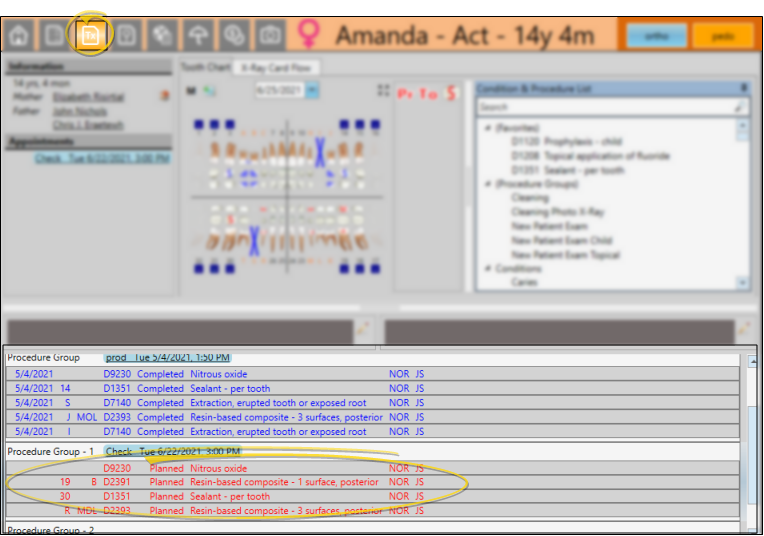 Click the Procedures bar to view dental procedures that have been applied to the patient. Right-click a planned procedure and select Forms, then Proposed Treatment to generate a Proposed Treatment Plan form for that dental procedure. You cannot create a proposed treatment form for a completed procedure. See "Patient Insurance Page" for details.