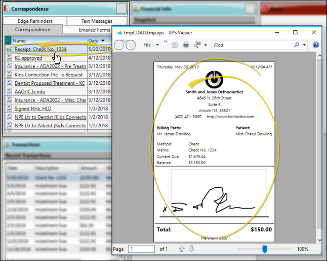 When you generate a receipt as you post a payment or refund, you have the opportunity to sign the receipt, and the event is recorded in the patient and responsible party correspondence histories.