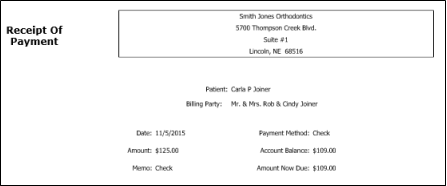 You can generate a receipt of payment for your patients as you post the transaction, or after the transaction is complete, in a variety of formats. When you print a receipt as you post a payment, a copy of the receipt is automatically added to both the patient and responsible party correspondence history. If you print a receipt later, the event is not recorded. The payment method is noted in the memo section of the receipt form. In addition, you may choose to email receipts to responsible parties, rather than printing them.