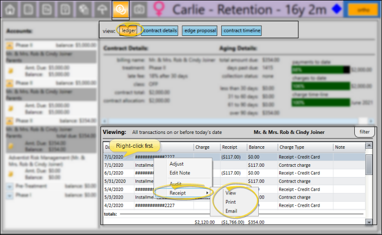 Open the patient folder Finance page and view the Ledger. Right-click the transaction you want, and choose Receipt. You can select View to choose the receipt output options; or select Print to generate the receipt with your current Quick Report settings; or select Email to use your Form Email Setup options. (See "Patient Transactions Panel" for details.)