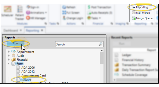 Select Reporting from the Reporting section of the Home ribbon bar. Then from the Form section, open the Receipt form. (You can also use the Search field to find the form you want to work with.) You might also be able to run this form from your Recent Reports or Quick Reports list. See "Run Edge Cloud Reports" for details. You will be able to select the receipt format options, and generate the form for one patient or a subgroup of patients.