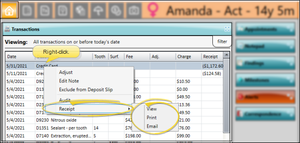 Open the patient folder Home page and be sure the Transaction panel is enabled. Right-click the transaction you want, and choose Receipt. You can select View to choose the receipt output options; or select Print to generate the receipt with your current Quick Report settings; or select Email to use your Form Email Setup options. (See "Patient Transactions Panel" for details.)