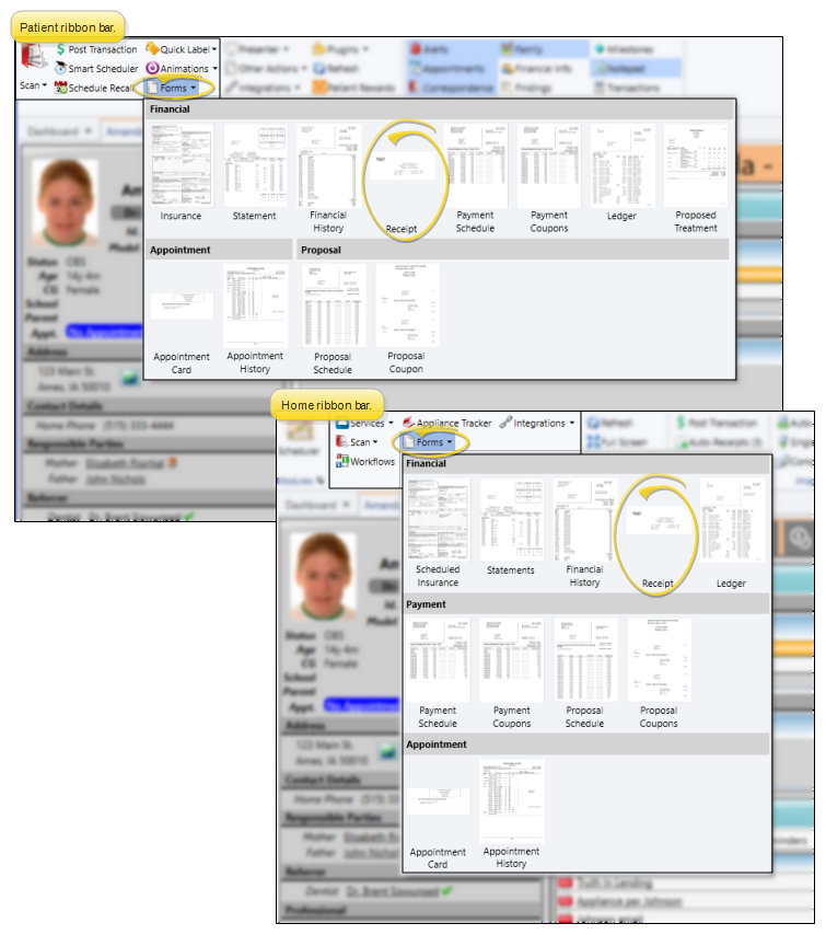 Select Forms then Receipt from the Patient section of the Patient ribbon bar, or from the Tasks section of the Home ribbon bar. If a patient folder is open and the orthodontics specialty is selected in the patient folder header, the default orthodontics statement from your Report and Form editor form is loaded. If a patient folder is open and the pediatric dentistry specialty is selected, the default pediatric dentistry statement is loaded. If no patient folder is open, the default orthodontics statement form is loaded. When you print a form from the Patient or Home ribbon bar, the results default to the Quick Report settings. If those settings include printing the form immediately, you will not have an opportunity to review before the form prints. See "Quick Reports" for details about creating / updating these settings.