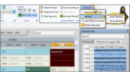 Select Actions from the Active Patient section of the Scheduler ribbon bar. Then choose the Receipt option. You can either select Email to send the receipt using your Form Email Setup options, or select Quick Receipt to print the receipt with your current Quick Report settings. The form will be generated for the patient's last-posted payment. (See "Your Scheduler" for details).